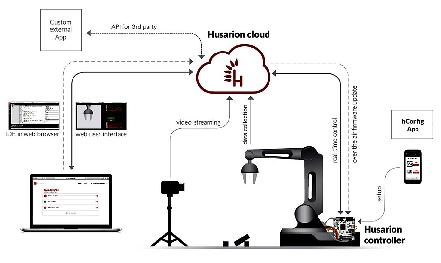 Husarion Cloud to narzędzie wygodne dla firm, dzięki którym mogą one w łatwy sposób budować połączone z Internetem mechatroniczne urządzenia, bez potrzeby utrzymywania własnej infrastruktury. Klienci tych firm korzystają ze swoich urządzeń przez Internet z poziomu konta użytkownika na http://cloud.husarion.com. Tam też producenci mogą zamieszczać aktualizację firmware’u urządzeń połączonych z chmurą Husarion. Zatem odpada problem przyjeżdżania z usługą wymiany firmware'u do klienta. Husarion udostępnia również internetowe API do usług oferowanych przez chmurę i do samych urządzeń połączonych z chmurą.