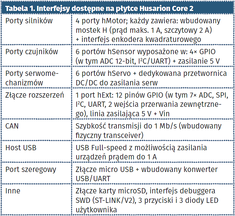 Na zakończenie opisu sprzętu parę drobiazgów. Płytka Husarion CORE2 ma wymiary 85 mm×94 mm×14 mm, waży 67 g. Można go zasilać napięciem z przedziału 6…16 V oraz ma wbudowane zabezpieczenia: nadprądowe, nadnapięciowe i przed odwrotnym podłączeniem zasilania.