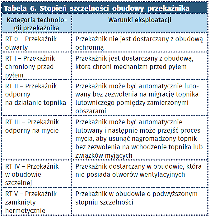 Odporność na warunki środowiskowe jest określana zgodnie z normą IEC 61810-7. Stopień uszczelnienia obudowy przekaźnika opisuje kategoria technologii – wymieniono je w tabeli 6.