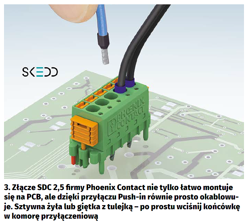 Nowe złącze serii SDC 2.5, jako pierwsze w ofercie firmy Phoenix Contact z serii elementów z przyłączem SKEDD, dostępne jest w rastrze 5 mm, od 1 do 16 biegunów. Nominalne parametry elektryczne to 12 A i 320 V. Samo przyłącze przewodów zrealizowano w technologii Push-in, z dodatkowym przyciskiem służącym do zwalniania przewodu. Akceptuje przekroje od 0,2 mm² do 2,5 mm² i mają dodatkowe miejsce na sondę pobierczą umożliwiającą pomiar napięcia bez rozłączania połączenia. Wtyk ma skuteczne zabezpieczenie przed rozłączeniem – po jego obu stronach wykonane są nity rozpierane wsuwanymi bolcami. Dostosowane jest do PCB o grubości 1,6 mm, które są najczęściej stosowanym standardem. Demontaż takiego złącza jest banalny – wystarczy zwolnić blokadę nitów i po prostu odczepić całość od płytki. Taki typ połączenia zapewnia trwałość do 25 cykli łączeniowych.