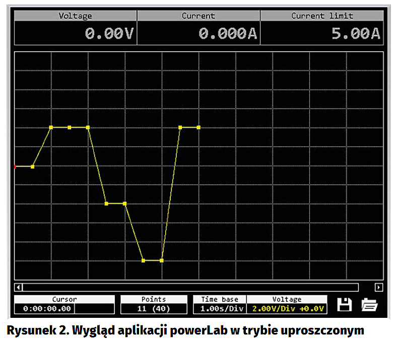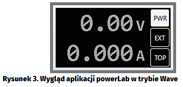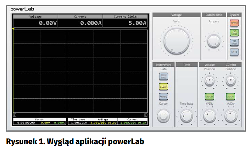 Wygląd aplikacji pokazano na rysunku 1. Jest to program dla systemu Windows, który sposobem obsługi nawiązuje do współczesnych oscyloskopów cyfrowych. W górnej części wirtualnego ekranu pokazano najważniejsze nastawy urządzenia, czyli aktualną wartość napięcia wyjściowego (Voltage), prądu odbiornika (Current) oraz nastawę wbudowanego ogranicznika prądowego (Current Limit). Główna część tegoż wirtualnego ekranu przeznaczona jest do wyświetlania różnorakich informacji, których to znaczenie zależne jest od trybu, w którym pracuje urządzenie.