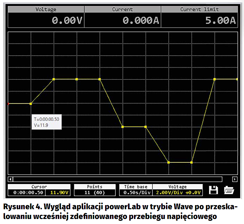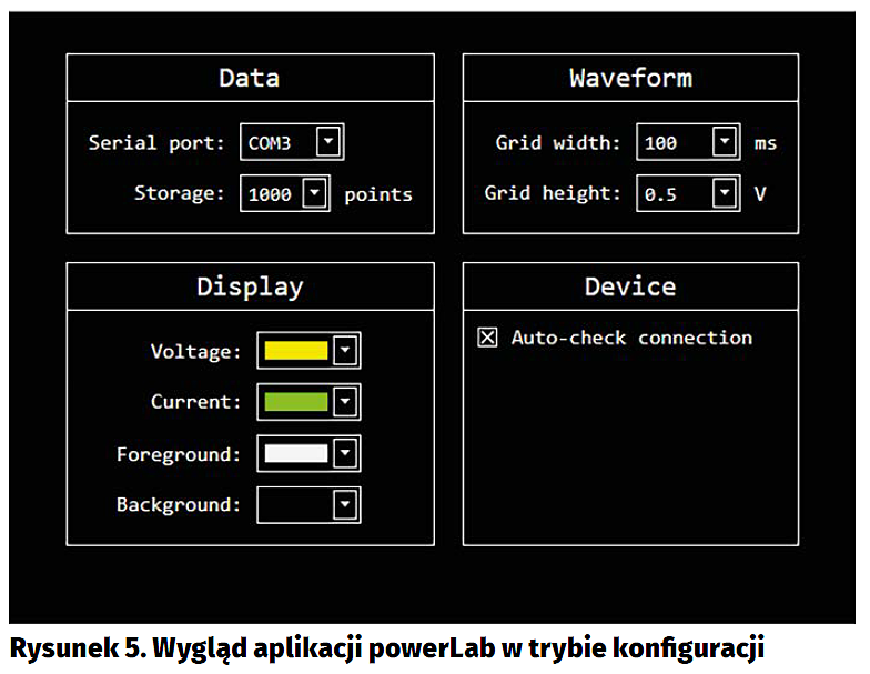 Przesłaniu zdefiniowanego przebiegu arbitralnego do zasilacza powerBank (użycie przycisku RUN/SEND) towarzyszy automatyczne przejście zasilacza do trybu „Wave”, czyli wyświetlenie stosownego ekranu w ramach graficznego interfejsu użytkownika urządzenia. Należy także zauważyć, że uruchomienie funkcji „Wave” w zasilaczu powoduje dezaktywację wybranych funkcji i pokręteł w ramach interfejsu użytkownika programu powerLab, gdyż w tym czasie (w czasie generowania przebiegu) zasilacz standardowo wyłącza odbiornik interfejsu USART, czyli nie jest w stanie odbierać żadnych danych regulacyjnych. Przycisk Clear służy do wyczyszczenia ekranu i jest aktywny zarówno dla funkcji „Store” (kasuje przebieg napięcia i prądu odbiornika), jak i funkcji „Wave” (kasuje zdefiniowany przebieg napięciowy) aplikacji. Ostatnim z ekranów, jakie nie zostały jeszcze opisane jest ekran ustawień aplikacji powerLab wywoływany po naciśnięciu przycisku Set (rysunek 5).