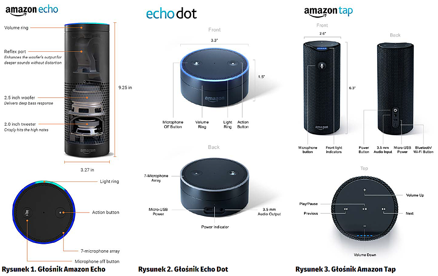 Najbardziej zaawansowanym z głośników Amazona jest Amazon Echo. Jest to urządzenia zasilane przewodowo (dedykowany zasilacz). Wewnątrz Amazon Echo zamontowano dwa głośniki audio: niskotonowy oraz wysokotonowy. Dodatkowo Amazon Echo można przyłączyć do zewnętrznego zestawu audio (wyjście AUX albo Bluetooth). Budowę głośnika pokazano na rysunku 1.