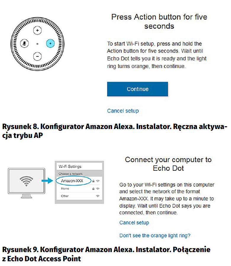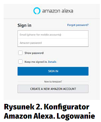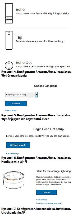 Urządzenia serii Echo z wbudowaną asystentką Alexa możemy konfigurować za pomocą aplikacji Amazon Alexa działającej na telefonach komórkowych oraz przy użyciu strony internetowej alexa.amazon.com. Aplikacja Amazon Alexa jest dostępna do pobrania wyłącznie dla użytkowników z terenu USA. Pozostaje nam zatem skorzystanie ze strony internetowej alexa.amazon.com. W tym celu, na komputerze z dostępem do sieci bezprzewodowej Wi-Fi uruchamiamy przeglądarkę internetową i wpisujemy adres konfiguratora alexa.amazon.com. Uruchomiony zostanie okno logowania do serwisu Amazon Alexa (rysunek 2). Wprowadzamy adres e-mail oraz hasło do konta w serwisie amazon.com i potwierdzamy. Nie mamy jeszcze dodanego urządzenia do naszego konta, więc automatycznie jest uruchamiany instalator urządzeń serii Echo (rysunek 3). W kolejnym kroku wybieramy rodzaj urządzenie z serii Echo, które będziemy instalowali. W naszym wypadku jest to Echo Dot (rysunek 4). Następnie wybieramy język, w którym będziemy komunikowali się z asystentką głosową Alexa. Dostępne opcje to: język angielski w wersji amerykańskiej lub brytyjskiej oraz niemiecki. Przy instalacji wybrałem komunikację z Alexą w języku angielskim w wersji amerykańskiej (rysunek 5). W kolejnym kroku przechodzimy do konfiguracji połączenia urządzenia Echo Dot z siecią bezprzewodową Wi-Fi (rysunek 6).