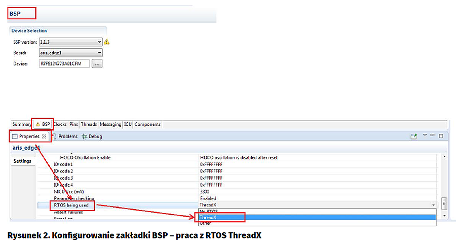 W oknie właściwości (Properties) klikamy na RTOS being used i z rozwijanej listy wybieramy ThreadX, tak jak to zostało pokazane na rysunku 2. Teraz, kiedy konfigurator już „wie”, że ma konfigurować projekt do pracy z ThreadX, można dodawać wątki zadania do wykonania. Każdy wątek to funkcja zawierająca pętlę nieskończoną while(1) {}. Funkcje wątków mogą zależnie od systemu RTOS mieć jakieś argumenty. W konfiguratorze e2studio wątki definiuje się bardzo prosto. Otwieramy zakładkę Threads i w oknie Threads klikamy na ikonkę dodawania (z zielonym plusem). Po dodaniu wątku w oknie właściwości zmieniamy jego nazwę adekwatnie do wykonywanego zadania. Ja zmieniłem nazwę na LED Thread, ponieważ wątek będzie miał za zadanie sterowanie diodą LED. Zmieniłem też nazwę symbolu na led_thread. Ta nazwa pojawi się potem w kodzie i warto również powiązać ją z wykonywanym zadaniem.