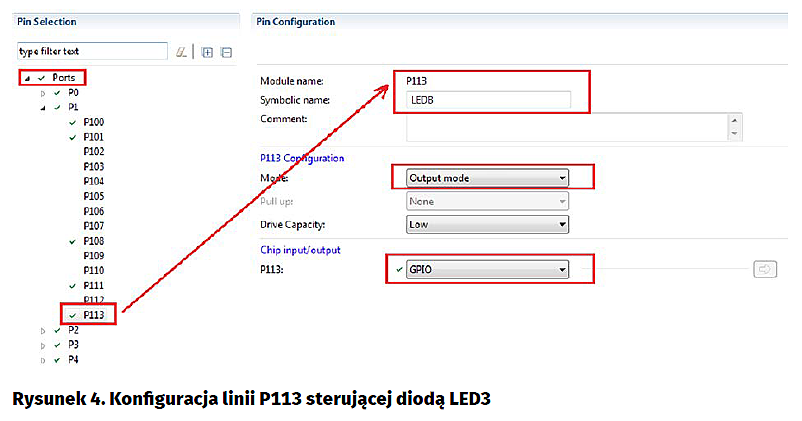 Każde naciśnięcie SW1 ma powodować zgłoszenie przerwania. Każde przerwanie trzeba skonfigurować i obsłużyć przez napisanie procedury obsługi. Konfigurację przerwania, a przerwania zewnętrznego w szczególności można wykonać za pomocą konfiguratora. Najpierw dodajemy do wątku moduł drivera obsługującego przerwanie zewnętrzne, jak na rysunku 6.