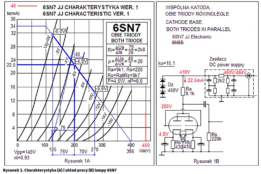 Parametry spoczynkowego punktu pracy dla typowej charakterystyki są następujące: Ua=250 V, Ia=9 mA, Us=–8 V. Nie jest to szczęśliwy wybór, ponieważ przy dopuszczalnym napięciu pracy 330 V dla lampy 6N8S i braku informacji o dopuszczalnym napięciu dla lampy nieobciążonej, a sytuacja taka ma miejsce przy włączeniu zasilania, zanim lampa się rozgrzeje i parametry pracy się ustabilizują, należy przyjąć, że jest to również napięcie dla lampy nieobciążonej. W bilansie trzeba też uwzględnić spadek napięcia na filtrze tętnień zasilacza anodowego około 50 V, gdy spadek napięcia na rezystorze anodowym Ra mógłby wynieść nie więcej niż 330 V-250 V-50 V=30 V, a wtedy jego wartość mogłaby wynieść co najwyżej R=30 V/9 mA=3,33 kV, więc taka aplikacja traci sens. Nieco lepiej wypada tutaj lampa 6SN7 JJ, w której przy napięciu dopuszczalnym 450 V spadek napięcia na rezystorze Ra może wynieść 150 V, a jego wartość wyniesie wtedy 16,7 kV. Jednak i w tym wypadku należy się liczyć z dużymi zniekształceniami liniowymi. Zmiana punktu pracy lampy z Ua=250 V, Ia=9 mA, Us=–8 V przy zachowaniu tej samej mocy 2,25 W na spoczynkowy punkt pracy: Ua=200 V, Ia=11,25 mA, Us=–4,8 V polepszy warunki pracy lampy. Na rysunkach 1a i 1b pokazano charakterystykę i aplikację dla nowego punktu pracy z tym, że z uwagi na dużą oporność wewnętrzną Ri w celu jej zmniejszenia, obie triody lampy połączono równolegle. W nowych warunkach pracy zmieni się też oporność wewnętrzna Ri, która będzie teraz mniejsza oraz nieco wzrośnie współczynnik amplifikacji µ, chociaż z wykresu to nie wynika, ale jest oczywiste, bo po przesunięciu punktu pracy z 250 V na 200 V wchodzimy w obszar, gdzie jednostkowym przyrostom napięcia siatkowego odpowiadają większe przyrosty napięć anodowych.