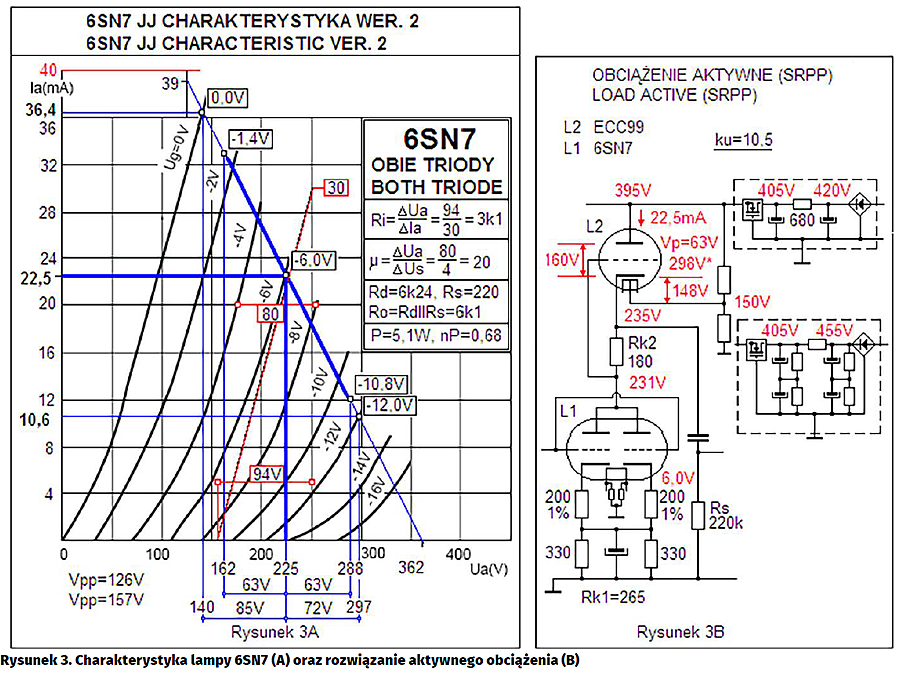 Na rysunku 3B zostało też zaproponowane „podbicie” napięcia na włóknie żarzenia lampy mniej więcej symetryczne z pozostawieniem ok. 50 V zapasu dla każdej z polaryzacji katod duotriody.