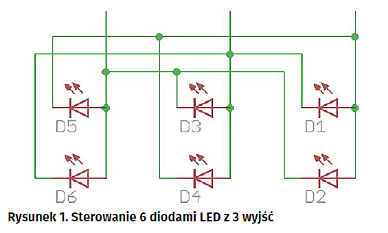 Celem tego artykułu jest przedstawienie sposobu ekonomicznego sterowania wieloma diodami LED bez użycia specjalizowanych układów – bezpośrednio z wyjść mikrokontrolera. Rozwiązanie takie jest szczególnie atrakcyjne, gdy np. musimy wysterować z mikrokontrolera kilka diod pełniących funkcję wskaźników, umieszczonych na oddzielnej płytce drukowanej przymocowanej do obudowy urządzenia, minimalizując przy tym liczbę połączeń pomiędzy płytką mikrokontrolera i płytką z diodami.