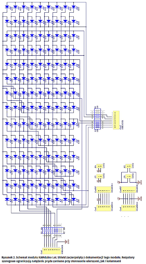 Typowo przy sterowaniu matrycy w konwencji charlieplexing używamy rezystorów szeregowych pomiędzy wyjściami mikrokontrolera i matrycą, ograniczających natężenie prądu płynącego przez diody matrycy. Odpowiada to zastosowaniu źródeł prądowych zarówno do wysterowania wierszy, jak i kolumn, co nie jest właściwe, gdyż jasność świecenia diod zależy wówczas od liczby diod zaświecanych równocześnie w wybranym wierszu. Pomimo niedoskonałości tego sposobu sterowania matrycą jest on często stosowany – w taki sposób jest skonstruowany np. popularny moduł LoL (Lots of Lights) w formacie zgodnym z Arduino (rysunek 2).