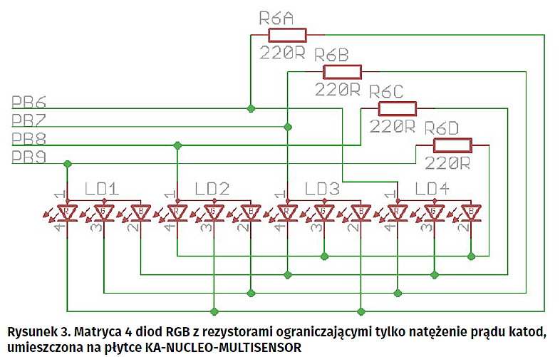 Pierwszy przykład demonstruje sterowanie diod RGB umieszczonych na płytce KA-NUCLEO-MULTISENSOR umieszczonej w złączach Morpho, zawartych na płytce Nucleo-64. Schemat połączenia diod przedstawia rysunek 3. Diody są sterowane z czterech linii portu GPIOB. Program został uruchomiony na płytce L476RG-Nucleo, zawierającej mikrokontroler STM32L476RGT.