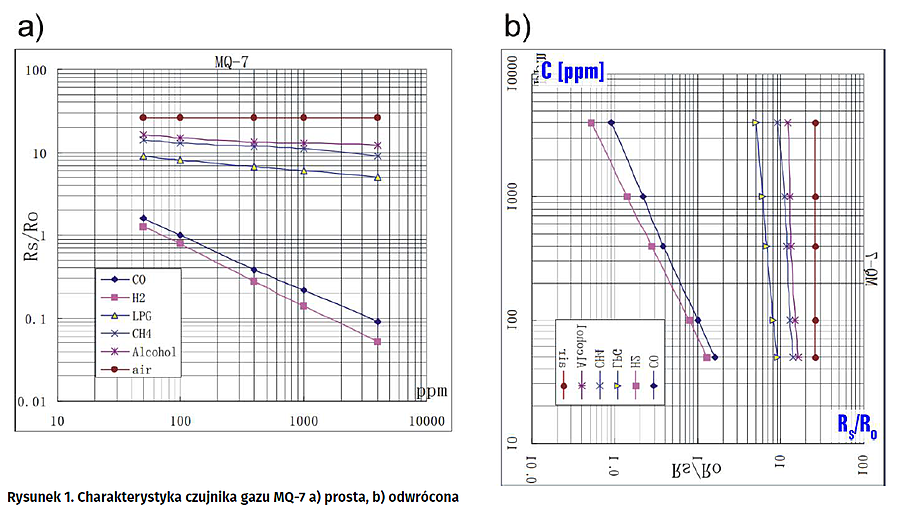 Nieco gorzej sprawa wygląda z czujnikami wyłącznie analogowymi. Konieczne jest wówczas zaprojektowanie odpowiedniego interfejsu sprzętowego oraz napisanie kodu, który dane cyfrowe uzyskane w wyniku próbkowania sygnałów analogowych z czujnika przeliczy na odpowiednią wielkość fizyczną. Typowym przykładem czujników tego rodzaju są sensory gazów. Stwarzają one problemy dwojakiego rodzaju. Po pierwsze, ich charakterystyki są bardzo, jeszcze raz powtórzę bardzo silnie nieliniowe. Po drugie, parametr wyjściowy – stężenie gazu – nie zależy wprost od bezpośrednio zmierzonego parametru czujnika, jakim najczęściej jest rezystancja. Do wyznaczenia wielkości mierzonej konieczne jest zmierzenie rezystancji czujnika w badanym środowisku (RS) i obliczenie stosunku tej rezystancji do rezystancji czujnika w środowisku odniesienia (RO). Same problemy. Jak zmierzyć rezystancję czujnika? Nie, o tym w tym artykule nie będzie mowy, gdyż koncentrujemy się na zupełnie innym zagadnieniu. Zakładamy, że rezystancję jakoś potrafimy zmierzyć. Obliczenie stosunku RS/RO z matematycznego punktu widzenie nie powinno stwarzać problemów. Pod warunkiem jednak, że znamy RO, a mamy jedynie mgliste pojęcie o tej wielkości. Wyznaczanie RO też nie jest tematem tego artykułu. Można jedynie powiedzieć, że RO daje się wyznaczyć podczas kalibracji w czystej atmosferze, a co gorsze jest to parametr zmieniający się w dużym zakresie nawet w obrębie elementów jednego typu. Z tego powodu producenci zwykle nie podają w danych katalogowych konkretnej wartości RO. Można się jedynie doszukać zakresu rozrzutu tego parametru.