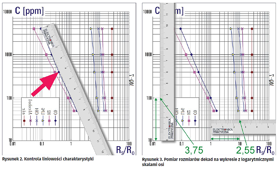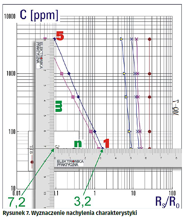 Dane punktów P1...P5 będą potrzebne w innych operacjach, a teraz już jest ten moment, w którym można wyprowadzić wyrażenie matematyczne opisujące charakterystykę czujnika dla gazu CO. Założyliśmy już, że w układzie podwójnie logarytmicznym mamy do czynienia z wykresem liniowym, dla którego w normalnym układzie obowiązywałoby znane z matematyki wyrażenie y=a*x+b. Uwzględniając skale logarytmiczne wyrażenie to przyjmuje postać: log(C)=a*log(RS/RO)+log(b) Współczynnik a jest równy tangensowi nachylenia charakterystyki i obliczamy go graficznie z wykresu, tak jak to przedstawiono na rysunku 7. Pamiętamy jednak o konieczności normalizowania linijkowych pomiarów parametrów m i n do szerokości dekad poszczególnych osi. Mamy więc a=m/n, gdzie zmierzone linijką parametry m i n po normalizacji są równe odpowiednio 7,2 cm/3,75=1,92 i 3,2 cm/2,55=1,255. Zatem uwzględniając, że wykres jest malejący a=–1,92/1,255=–1,530. Pozostaje jedynie obliczyć przesunięcie wykresu w osi pionowej, a więc log(b). Korzystamy ze znajomości wartości funkcji C(RS/RO) w dowolnie wybranym jej punkcie. Niech to będzie punkt P2(1,100). Podstawiając te wartości do formuły opisującej funkcję mamy: log(100)=–1,53*log(1)+log(b), z czego wynika, że log(b)=log(100)–(–1,53)*log(1)=2+1,53*0=2.