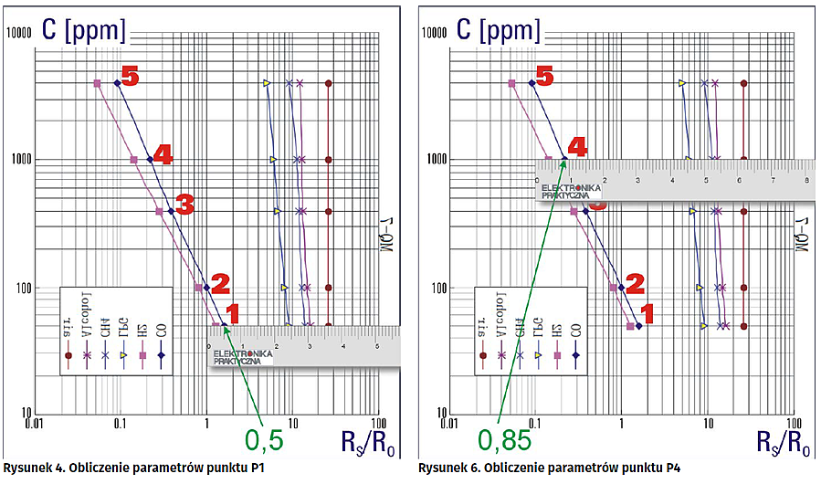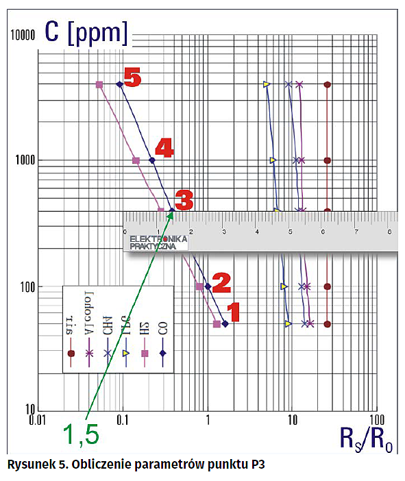Odczytajmy teraz parametry punktu oznaczonego cyfrą „1”. Jest to punkt położony dokładnie na linii wyznaczającej stężenie 50 ppm. Odstępy między liniami w pierwszej dekadzie na osi odciętych wynoszą 10, w drugiej 100 itd. Ponieważ punkt leży dokładnie na linii nie będą potrzebne żadne przeliczenia dla tej rzędnej. Należy natomiast wyznaczyć odpowiadający temu stężeniu stosunek RS/RO. Mierzymy więc odległość punktu „1” od najbliższej linii rozpoczynającej dekadę, w której ten punkt leży, a więc od linii o odciętej 1. Odległość ta jest równa 0,5 cm (rysunek 4), a zatem RS/RO jest w tym punkcie równe (patrz - plik PDF).