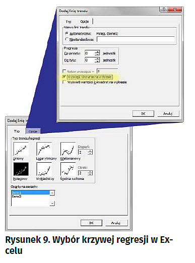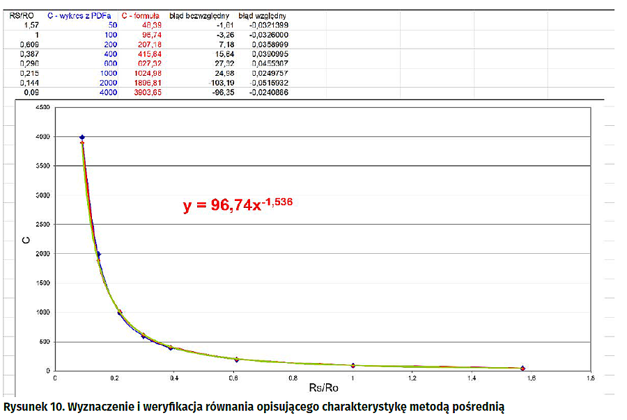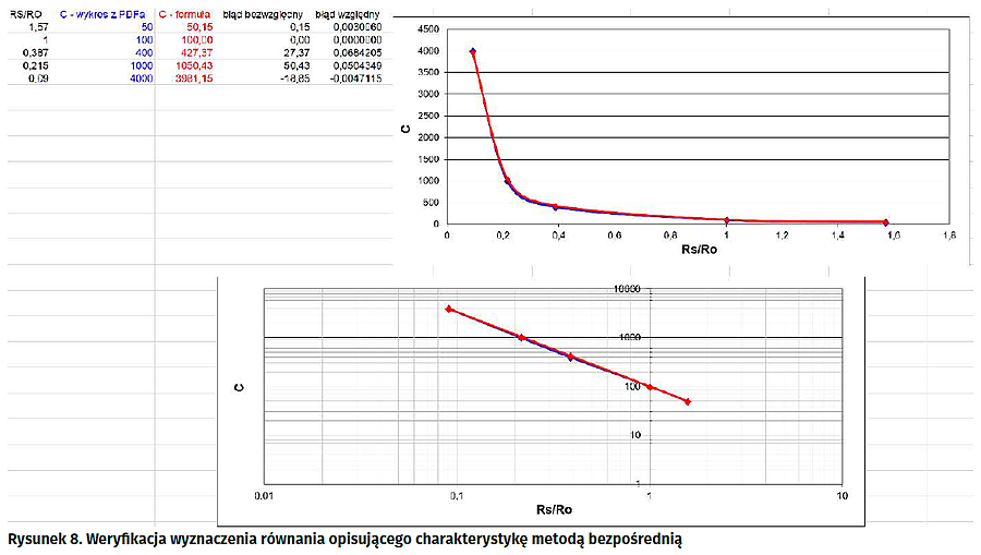W tej metodzie skorzystamy również z Excela, przy czym tym razem nie będzie on weryfikował danych, a posłuży do wyznaczenia formuły opisującej wykres. Pierwszą czynnością jest przeniesienie danych do arkusza. To już potrafimy, co więcej mamy to już zrobione (rysunek 8). Przy takiej nieliniowości charakterystyki z jaką mamy do czynienia 5 punktów może się okazać liczbą niewystarczającą. Poznanymi metodami dodajmy jeszcze ze dwa, trzy punkty. Na przykład: P6(0,609, 200), P7(0,296, 600) i P8(0,144, 2000). Następnie tworzymy na podstawie tych punktów wykres punktowy z wygładzonymi liniami. Kolejną czynnością jest dodanie linii trendu typu potęgowego, koniecznie z opcją wyświetlania równania na wykresie (rysunek 9). Ostatecznie arkusz będzie zawierał dane liczbowe i wykresy, ale nas najbardziej będzie interesowało równanie opisujące linię trendu (rysunek 10). Linia ta z niezłą dokładnością odwzorowuje charakterystykę czujnika (patrz - plik PDF).