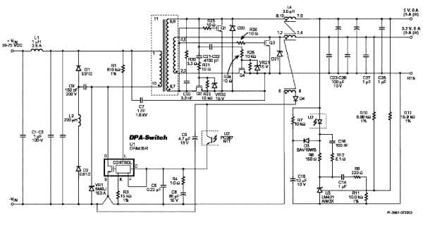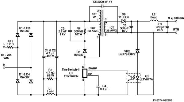 Zasilacz sieciowy musi gwarantować bezpieczeństwo użytkownika i dlatego do najważniejszych jego funkcji należy zapewnienie izolacji galwanicznej od sieci, co wykonuj się z użyciem transformatora impulsowego mającego minimum dwa oddzielne uzwojenia. Jest wiele topologii zapewniających przetwarzanie energii z izolacją, ale w zasilaczu o małej mocy przeważnie stosuje się, pokazaną na rysunku 1, topologię przetwornicy zaporowej. Dobrze sprawdza się ona przy obciążeniu do 50 W, jednak w praktyce są oferowane również wersje oddające do obciążenia nawet dwukrotnie większą moc.
