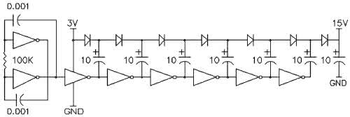 Najczęściej konwertery tego typu zawierają generator impulsów prostokątnych pracujący z częstotliwością kilkudziesięciu kHz, chociaż spotykane są też rozwiązania zasilane napięciem o innym kształcie. Napięcie zmienne jest podawane na powielacz złożony z diod i kondensatorów, w którym liczba członów jest zależna od wymaganego napięcia wyjściowego. Jak wspomniano, ten rodzaj przetwornicy nie wymaga indukcyjności i dlatego bez trudu może być zintegrowany w obudowie układu scalonego. Sprawność energetyczna jest niska, a wartość napięcia wyjściowego zależy od obciążenia, co utrudnia jego stabilizowanie. Co ciekawe, coraz częściej konwertery tego typu są wykorzystywane w aplikacjach oświetleniowych wspólnie z superjasnymi diodami świecącymi.