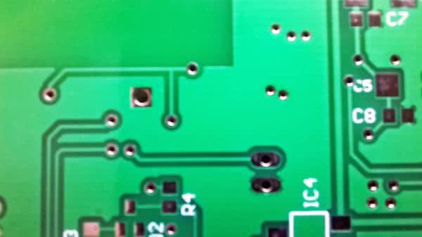 Układ nie dość, że ma obudowę trudną do przylutowania w warunkach domowego warsztatu (MLPQ16), to jeszcze na spodniej stronie znajduje się powierzchnia (exposed pad), która bezwzględnie musi być dołączona do masy. W swojej płytce pod układem zaprojektowałem metalizowaną przelotkę o średnicy 1,6 mm, dzięki czemu mogłem przylutować ten pad od spodu (fotografia 2). Oczywiście, jeżeli ktoś ma możliwość przylutowania układu za pomocą stacji lutowniczej hot air z użyciem pasty lutowniczej przelotka jest zbędna.