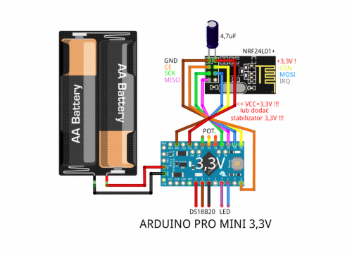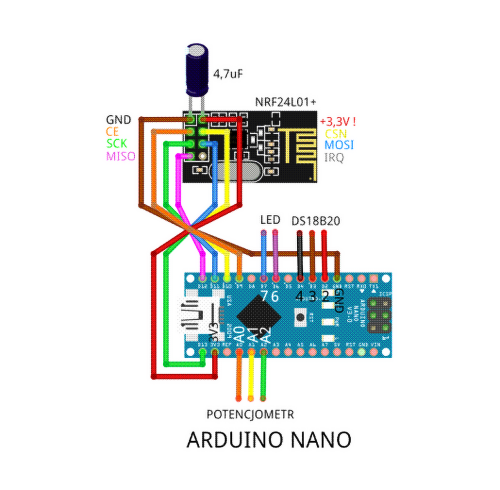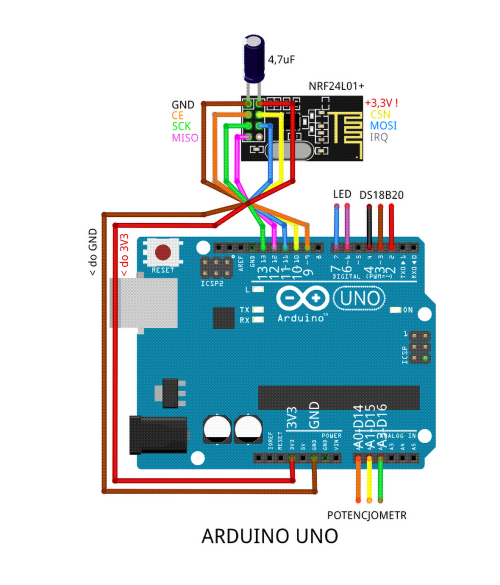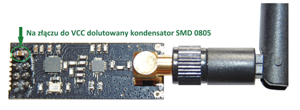 Pamiętajmy o dołączeniu kondensatora pomiędzy przewody zasilające radio. Jest to zalecane przez twórców MySensors i dość istotne przy stosowaniu połączeń długimi przewodami. Wyprowadzenia sterujące modułu radia mogą bezpośrednio współpracować z układami zasilanymi napięciem 5 V.