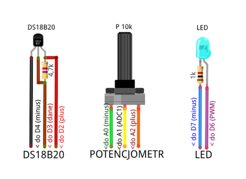 Do modułu Arduino dołączamy czujniki, które w tym przykładzie, dla uproszczenia układu połączeń, są zasilane z wyjść procesora, ale można zasilać je wprost z linii zasilających płytki. Oczywiście musimy pamiętać o rezystorach przy diodzie LED i czujniku DS18B20. W związku z łączeniem układów mam jedną praktyczną uwagę. Proponuję w układach montowanych do dłuższej pracy stosować połączenia lutowane. Jednym z częściej występujących błędów w testowanych czujnikach była utrata komunikacji pomiędzy modułem Arduino i radiem. Po poprawieniu połączeń na „goldpinach” i restarcie wszystko wracało do normalnej pracy. Niestety te goldpiny, dołączane teraz do modułów, nie są już takie gold, jak były kiedyś ;).