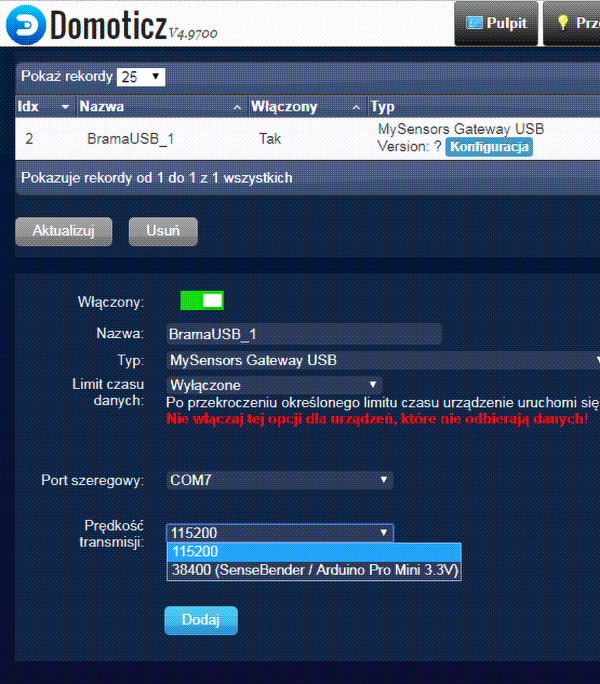 Z strony www.domoticz.com/downloads/ ściągamy stabilną wersję programu Domoticz dla Windows. Rozpakowujemy plik i przeprowadzamy standardową instalację. Po instalacji program uruchamia się jako strona internetowa i jest po angielsku. Wybieramy u góry zakładkę Setup → Settings, gdzie ustawiamy w Language opcję Polish, a w Location określamy swoją lokalizację. Zatwierdzamy nowe ustawienia, klikając na czerwone pole Apply Settings. Teraz dołączamy do komputera bramę i wybieramy u góry Konfiguracja → Sprzęt. Na stronie, która zostanie wyświetlona (rysunek 5), w polu Nazwa nadajemy nazwę naszej bramie. Wybieramy typ – MySensors Gateway USB i określamy port COM, do którego jest dołączone Arduino obsługujące bramę. Na koniec wybieramy prędkość transmisji – domyślnie jest to 115200 dla Arduino taktowanego kwarcem 16 MHz. Jeżeli Arduino sterujące bramą taktowane jest z częstotliwością 8 MHz, to ustawiamy prędkość na 38400 bps. Przyciskiem Dodaj na dole strony dodajemy nową bramę do listy sprzętu.