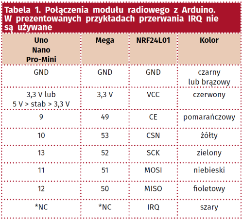 Połączenie modułów radiowych z płytkami Arduino i czujnikami wykonujemy, wzorując się na załączonych rysunkach. Wskazane jest, by przewody były jak najkrótsze. Do połączeń możemy użyć przewodów z kolorowych taśm, co bardzo ułatwia montaż. W tabeli 1 zestawiono połączenia modułu radiowego z Arduino w zależności od jego typu.