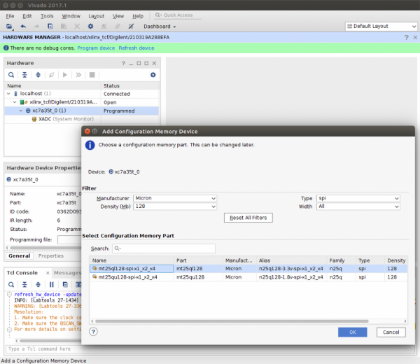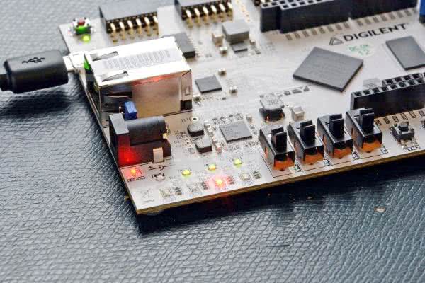 Po uruchomieniu Vivado otwórz okno Hardware manager i połącz się z docelową płytką (rysunek 5). Następnie kliknij na FPGA prawym przyciskiem myszy, wybierz opcję Add Configuration Memory Device, a następnie wybierz Micron n25q128-3.3v (rysunek 6). Jeśli zdecydujesz się na zaprogramowanie urządzenia, możesz wybrać pobrany plik .mcs. Po zakończeniu programowania, jeżeli zostanie naciśnięty czerwony przycisk oznaczony PROG, układ FPGA zostanie skonfigurowany i powinien uruchomić się program demonstracyjny, sygnalizujący swoje działanie za pomocą migania diod LED1 i LED2 (fotografia 7).