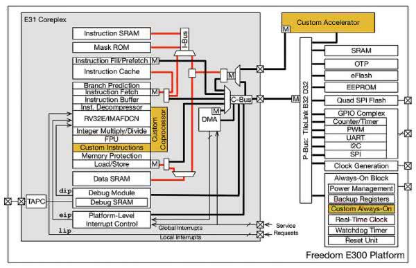 SiFive to organizacja komercyjna, która została założona przez twórców RISC-V, dostarcza produkty, które zawierają rdzenie IP i platformy SoC, opracowane i publikowane jako IP core’y. Ich podstawowa platforma sprzętowa SoC o nazwie Freedom E300 jest oparta o rdzeń E3 Coreplex, dostępny jako IP core do implementacji w układach ASIC, może być także stosowana w układach FPGA. Projekt układu Freedom E310, który umieścimy w pamięci konfiguracyjnej płytki Arty, opiera się na architekturze SoC przedstawionej na schemacie lokowym z rysunku 1.