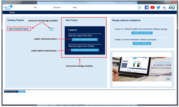 - Utworzyć nowy projekt z kryterium wyboru mikrokontrolera lub płytki ewaluacyjnej ST.