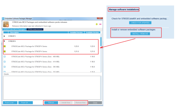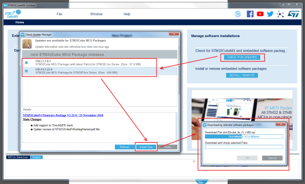 Pierwszą rzeczą, którą można zrobić po zainstalowaniu STM32CubeMX, jest zainstalowanie składników bibliotek właściwych dla każdej z rodzin mikrokontrolerów STM32. Jest to wykonywane po kliknięciu na przycisk „Install/Remove” w oknie Manage software installations Installor Remove embedded software packages (rysunek 2). Aby mieć pewność, że są wgrywane biblioteki w najnowszej wersji, można przed ich zainstalowaniem wykonać uaktualnienie, jak to zostało pokazane na rysunku 3. Konfigurator łączy się z serwerem firmy ST, automatycznie sprawdza najnowszą, dostępną wersję i po kliknięciu na „Install Now” proces uaktualniania wykonuje się automatycznie.