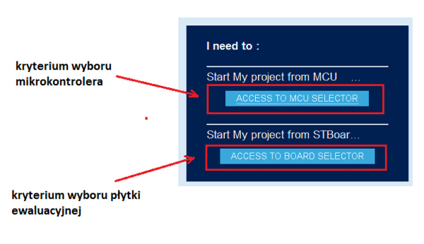 Wybór mikrokontrolera w czasie tworzenia nowego projektu ułatwia selektor działający w oparciu na kryterium doboru konkretnego modelu MCU (opcja Access to MCU Selector) lub płytki ewaluacyjnej (opcja Access To Board Selector), jak na rysunku 4.