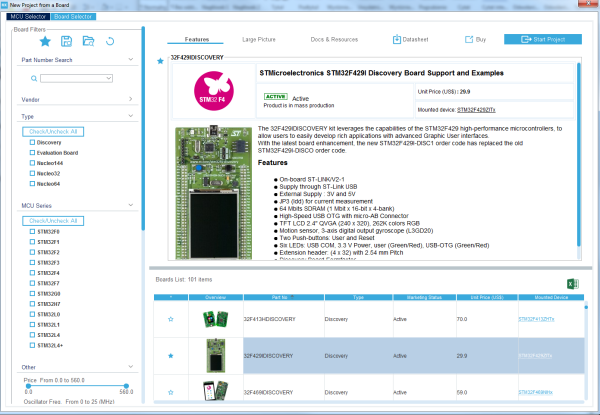 W górnym oknie można wyświetlić powiększone zdjęcie modułu, uzyskać dostęp do dokumentów, takich jak instrukcja użytkownika lub noty aplikacyjne i zamówić moduł przez Internet. Jeżeli wybrany moduł spełnia wszystkie kryteria, można przejść do kreatora projektu przez kliknięcie na przycisk „Start Project”. Do wygenerowania przykładowego projektu wybrałem moduł 32F429IDISCOVERY.