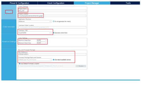 Okno menedżera projektu jest podzielone na trzy kolejne okna: Project, Code Generator, Advanced Settings. W oknie Project (rysunek 6) użytkownik wybiera nazwę projektu, lokalizację na dysku komputera, IDE, dla którego STM32CubeMX wygeneruje szkielet projektu, ustawienia linkera (rozmiar sterty i stosu) oraz typ wybranego mikrokontrolera i właściwe dla niego biblioteki programowe. Ja wybrałem projekt o nazwie test_LCD przeznaczony dla IDE TrueStudio.
