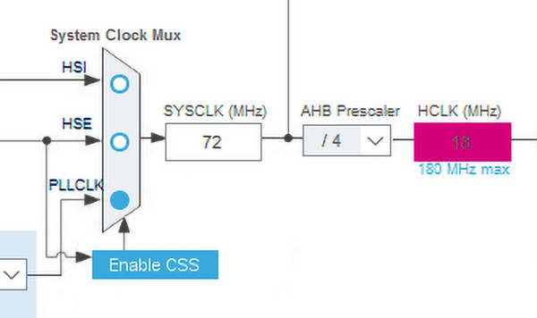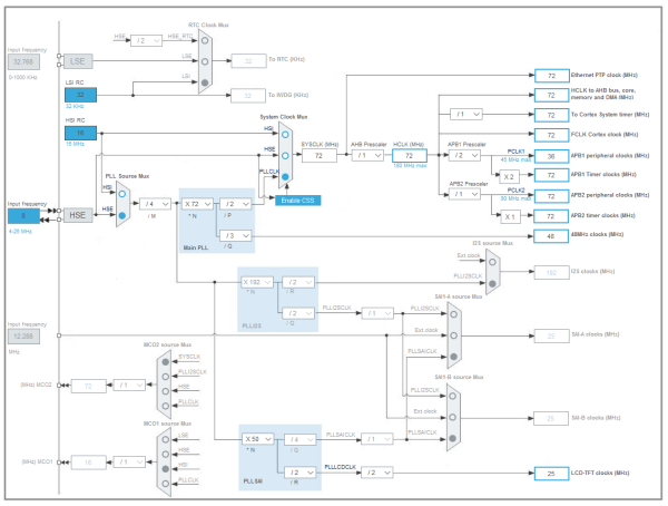 Okno Clock Configurator pozwala na szybkie ustawienie układu taktowania rdzenia i układów peryferyjnych mikrokontrolera. Układy z rdzeniem ARM mają dość rozbudowany system taktowania. Użytkownik musi wybrać źródło głównego sygnału zegarowego. Może to być generator HSE stabilizowany zewnętrznym oscylatorem kwarcowym lub wbudowany oscylator RC (HSI RC) o częstotliwości 16 MHz. Sygnał zegarowy z HSE lub HSI RC jest podawany na układ PLL, gdzie jest modyfikowana jego częstotliwość. Dla zastosowanego mikrokontrolera ustawiono taktowanie rdzenia z częstotliwością 72 MHz. Programowany blok taktowania pozwala też na uzyskanie z układów PLL przebiegu o częstotliwości 48 MHz do taktowania bloku interfejsu USB, bloku komunikacyjnego I2S (na przykład 192 MHz) oraz bloku LTDC sterującego wyświetlaczem LCD TFT. Na rysunku 7 pokazano okno konfiguracji zegara dla mikrokontrolera modułu 32F429IDISCOVERY. Konfigurator, oprócz graficznej, intuicyjnej możliwości zaprogramowania taktowania wykrywa błędy konfiguracji i podświetla na czerwono nieprawidłowo ustawione wartości (rysunek 8).