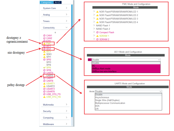 Nazwy bloków funkcjonalnych są oznaczane kolorami: czerwonym, zielonym i czarnym. Kolor czerwony oznacza, że nie można przypisać ich linii do wyprowadzeń mikrokontrolera, bo są już zajęte przez inne peryferie. Nazwa w kolorze zielonym z symbolem żółtego wykrzyknika informuje, że blok może być użyty, ale z ograniczeniami. Jeżeli nazwa bloku funkcyjnego jest wyświetlana bez symbolu i w kolorze czarnym, to można go użyć bez ograniczeń. Na rysunku 9 pokazano listę bloków komunikacyjnych (Connectivity) z przykładowymi konfiguracjami dla bloków niedostępnych, dostępnych z ograniczeniami i z pełnym dostępem. Z prawej strony rysunku pokazano opcje konfiguracji dla każdego z tych przypadków. Natychmiastowe wykrywanie kolizji konfiguracji bloków funkcjonalnych jest jedną z moich ulubionych funkcji STM32CubeMX. Przy rozbudowanych mikrokontrolerach wystarczy rzut oka, aby zorientować się, że mogą być problemy z użyciem potrzebnych bloków lub ich użycie w konkretnej konfiguracji w ogóle nie będzie możliwe.