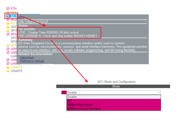 Oprogramowanie STM32CubeMX potrafi podpowiedzieć przyczynę, dla której użycie bloku funkcjonalnego w danej konfiguracji nie jest możliwe lub może być ograniczone. Na rysunku 10 pokazano, że blok I2C1 nie może być konfigurowany, bo jego wyprowadzenia są zajęte przez już skonfigurowany blok LTDC służący do sterowania wyświetlaczami LCD-TFT oraz alternatywnie przez blok FMC. Jedyna dostępna opcja dla I2C1 to wyłączenie (Disable).