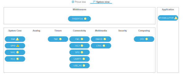Dla bardziej zaawansowanych użytkowników istotna będzie możliwość dodawania funkcji warstwy middleware. W projekcie z wybranym modułem 32F429IDISCOVERY można dodawać i konfigurować: system plików FATFS, system czasu rzeczywistego FreeRTOS, zaawansowaną bibliotekę graficzną Graphics, bibliotekę kryptograficzną MBEDTLS, bibliotekę PDM2PCM do konwersji strumienia danych PDM z mikrofonu MEMS na strumień danych PCM, obsługę interfejsu USB_HOST.