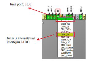 W selektorze projektu wybraliśmy moduł ewaluacyjny 32F429IDISCOVERY. Dla wybranej płytki ewaluacyjnej typu 32F429IDISCOVERY oprogramowanie STM32CubeMX domyślnie skonfigurowało kilka bloków funkcjonalnych oraz middleware RTOS (rysunek 11). Każdy z bloków funkcjonalnych wymagających połączenia z wyprowadzeniami mikrokontrolera ma takie połączenia definiowane automatycznie. Na rysunku 12 pokazano fragment okna z rysunkiem obudowy mikrokontrolera z rozwijaną lista dostępnych połączeń alternatywnych dla wyprowadzenia linii portu PB8 (dostępna po kliknięciu prawym przyciskiem myszy na wyprowadzenie), a na rysunku 13 sposób zmiany przypisanej etykiety.
