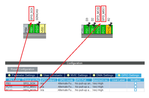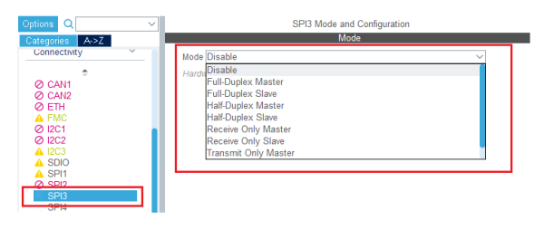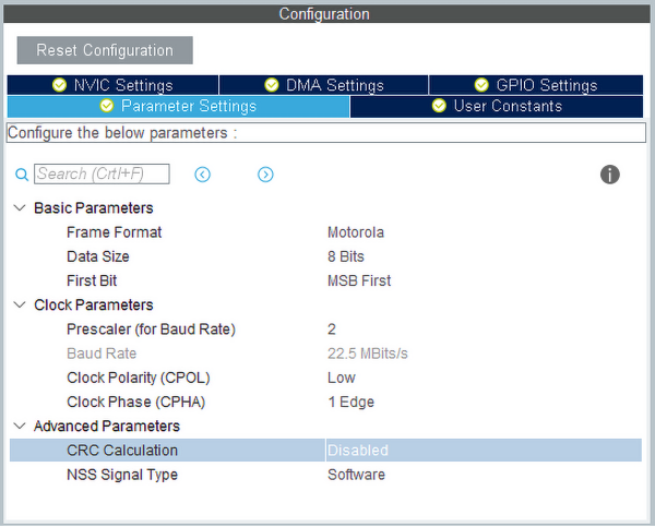 Sposób konfiguracji nowego bloku funkcjonalnego pokażemy na przykładzie szeregowego interfejsu SPI3. W naszym wypadku jest to układ z dostępem bez ograniczeń (na liście bloków jego nazwa jest wyświetlana w kolorze czarnym). Po kliknięciu jego nazwy na liście jest wyświetlane okno SPI3 Mode and Configuration. W rozwijanym oknie Mode możemy wybrać tryb pracy interfejsu (rysunek 14). Dla przykładu, wybieramy Full-Duplex Master. Pod oknem SPI3 zostaje pokazane okno Configuration, w którym wykonujemy właściwą konfigurację interfejsu. W oknie konfiguracji jest kilka zakładek. Pierwsza to Parameter settings. Ustawiamy tu podstawowe parametry, a więc format ramki (Motorola/TI), długość słowa danych (8/16 bitów) i dosunięcie bitów w ramce danych (LSB/MSB). W następnej kolejności można zaprogramować prędkość transmisji przez ustawienie preskalera (od 2 do 256) oraz polaryzację CPOL i fazę CPHA zegara. Okno ustawień parametrów pokazano na rysunku 15. W oknie GPIO Settings są zdefiniowane przypisania linii portów mikrokontrolera do linii interfejsu SPI3. STM32CubeMX automatycznie przypisuje te linie do konfiguracji domyślnej (rysunek 16).