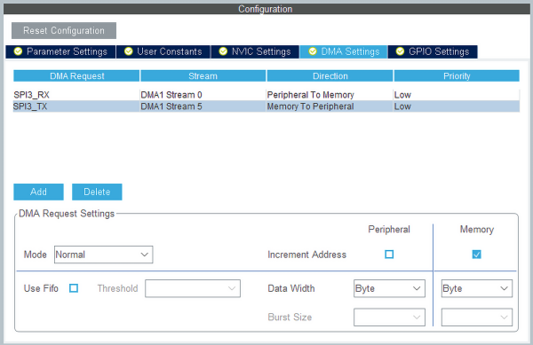 Jeżeli w zakładce NVIC Settings zaznaczymy pole Enabled, to zostanie odblokowane globalne przerwanie zgłaszane przez SPI3. W zakładce DMA Settings można zdefiniować pracę kanału DMA. Po kliknięciu na przycisk „Add” jest dodawany kanał DMA z dostępem SPI3_RX (dane odebrane przez SPI3) lub SPI3_TX (dane wysyłane przez SPI3). W okienku DMA Request Settings wybiera się tryb Normal lub Circural oraz inkrementację adresu. Można też zaznaczyć użycie bufora FIFO. Przykładową konfigurację kanału DMA dla interfejsu szeregowego SPI3 pokazano na rysunku 17. Jak widać, skonfigurowanie szeregowego interfejsu komunikacyjnego nie jest specjalnie trudne ani pracochłonne.