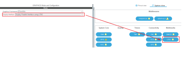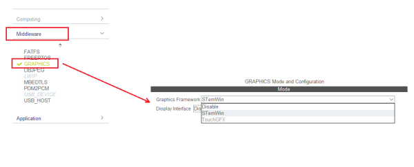 Dodawanie i konfigurowanie middleware pokażemy na przykładzie biblioteki graficznej Graphics. Wybieramy ją z listy middleware i w oknie Graphics Mode and Configurations wskazujemy jedne z dostępnych bibliotek i środowisk narzędziowych: STemWin bezpłatną przygotowaną dla mikrokontrolerów STM32 przez firmę Segger lub również bezpłatną TouchGFX (rysunek 18). Każda z tych opcji oprócz bibliotek dostarcza wygodne graficzne środowisko projektowe służące do projektowania ekranów z umieszczonymi na nich widżetami, tekstem itp.