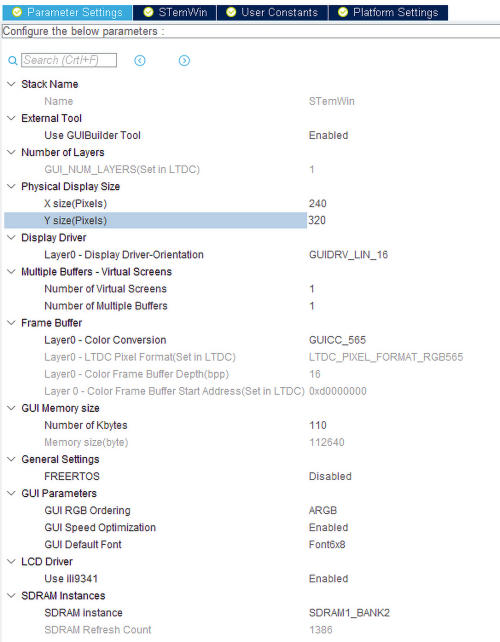 Po wybraniu STemWin możemy przystąpić do konfigurowania biblioteki w oknie Configuration. Mamy tu do dyspozycji cztery zakładki: Parameter Settings, STemWin, User Constans i Platform Settings.