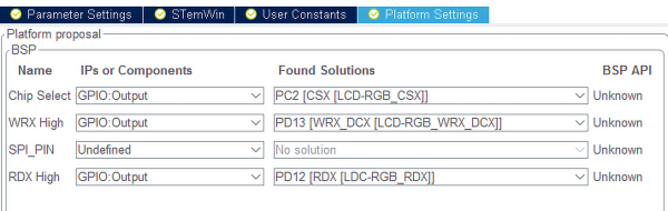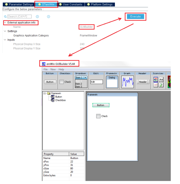 Ustawienie możliwości użycia GUIBuilder w zakładce Parameter Settings umożliwia (po kliknięciu na przycisk Execute) otworzenia narzędzia emWin GUIBuilder z zakładki STemWIN (rysunek 22). Okno Platform Settings definiuje przypisanie linii dodatkowego interfejsu szeregowego używanego do komunikacji ze sterownikiem panelu LCD-TFT (rysunek 23). W podobny sposób możemy konfigurować pozostałe moduły z listy middleware.
