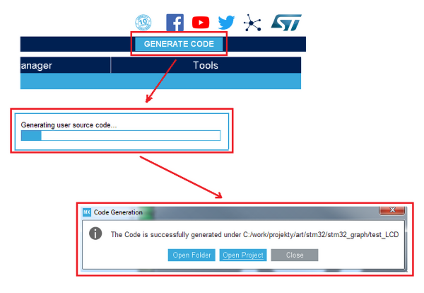 Generowanie szkieletu projektu z wykonanymi przez nas konfiguracjami układów peryferyjnych i ewentualnie middleware jest wykonywane po kliknięciu na przycisk „Generate Code”. Na końcu procesu generowania kodu źródłowego jest wyświetlane okno, w którym możemy otworzyć projekt w środowisku projektowym IDE (tu używamy TrueStudio) wybranym w zakładce Project Manager programu STM32CubeMX (rysunek 24).