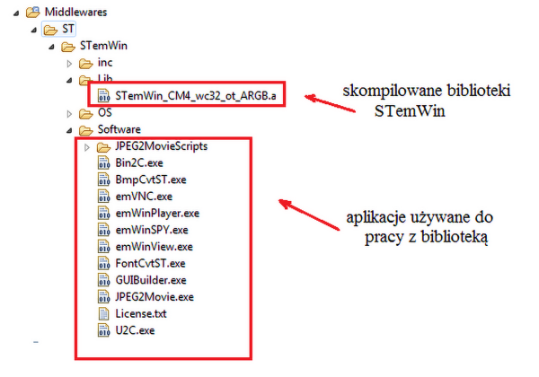 Skompilowaną bibliotekę graficzną emWin w wersji STemWin umieszczono w katalogu MiddlewaresSTemWinLib, jak to pokazano na rysunku 27. Co ciekawe, katalog MiddlewaresST-STemWinSoftware zawiera programy wykorzystywane w trakcie pracy z biblioteką graficzną.