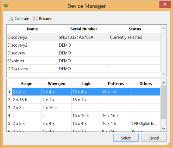 Po uruchomieniu środowiska, ujrzymy okno wyboru urządzenia (rysunek 1). Jeżeli instalacja przebiegła poprawnie, wyświetli się urządzenie Discovery 2 i jego numer seryjny (rysunek 2). Możliwe jest użycie WaveForms w trybie testowym bez podłączonego AD2. Ewentualne zmiany używanego urządzenia można przeprowadzić klikając w menu Settings → Device manager.
