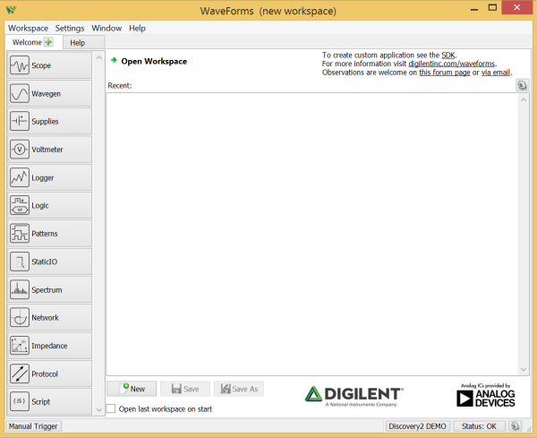 Po wybraniu używanego urządzenia AD2 wyświetli się okno główne środowiska (workspace). Workspace jest odpowiednikiem „projektu”. Możliwy jest zapis konfiguracji, na przykład, ustawienia oscyloskopu lub generatora. Po lewej stronie ekranu są widoczne przyciski odpowiadające poszczególnym funkcjom AD2: