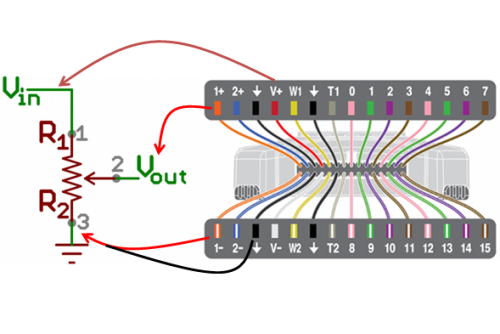Najprostszym pomiarem, który można wykonać korzystając z Analog Discovery 2 jest pomiar napięcia. W tym przykładzie posłużymy się potencjometrem, który pozwoli na regulowanie mierzonego napięcia. Schemat połączeń obwodu testowego pokazano na rysunku 4. Złącza zasilacza doprowadzono do pinów 1 (V+) i 3 (GND) potencjometru. Pomiar napięcia odbywa się poprzez sygnały oscyloskopu: 1+ i 1–. Różnicowe wejście dodatnie dołączono do pinu 2 potencjometru, a ujemne do GND. Nie ma znaczenia, do którego GND w AD2 dołączymy masę układu.