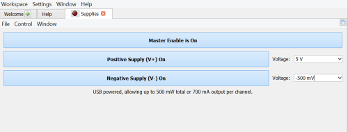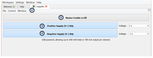 Po wykonaniu połączeń trzeba skonfigurować zasilacz. Po kliknięciu na przycisk Supplies w WaveForms zostanie wyświetlone okno przedstawione na rysunku 5.Obok nazwy Supplies (1) znajduje się symbol strzałki w prawo „u”, który można kliknąć, aby włączyć zasilacz. Jeżeli zasilacz jest włączony, to w tym miejscu jest wyświetlany symbol kropki „=”. Jeśli zasilacz zostanie przeciążony, to zostanie wyłączony, a stan urządzenia ponownie wróci do znaku „u”.