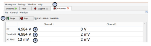 Aby wykonać pomiar napięcia, należy w oknie głównym programu WaveForms kliknąć pole Voltmeter. Pomiar nie wymaga konfiguracji, wystarczy tylko uruchomić woltomierz (1). Przycisk Single (2) umożliwia wykonanie pojedynczego pomiaru. Pomiary wykonywane są w trybie: